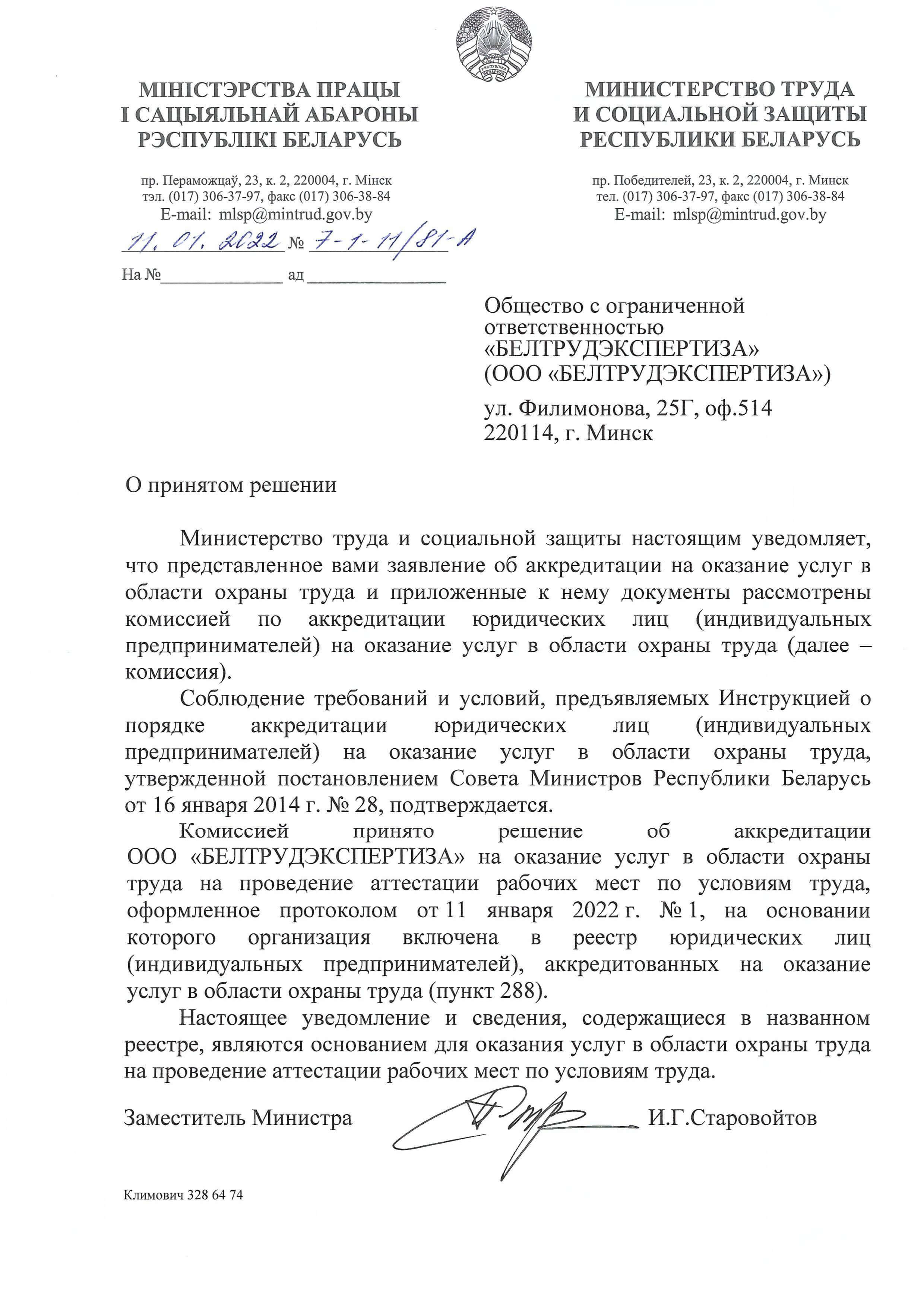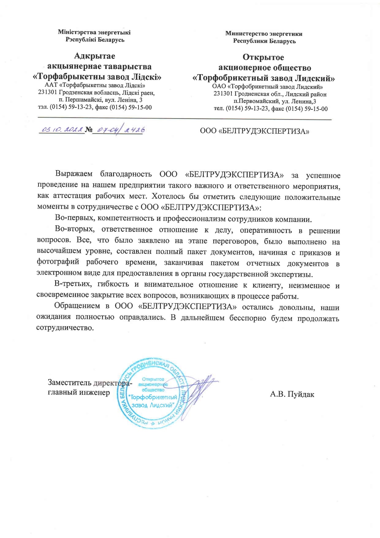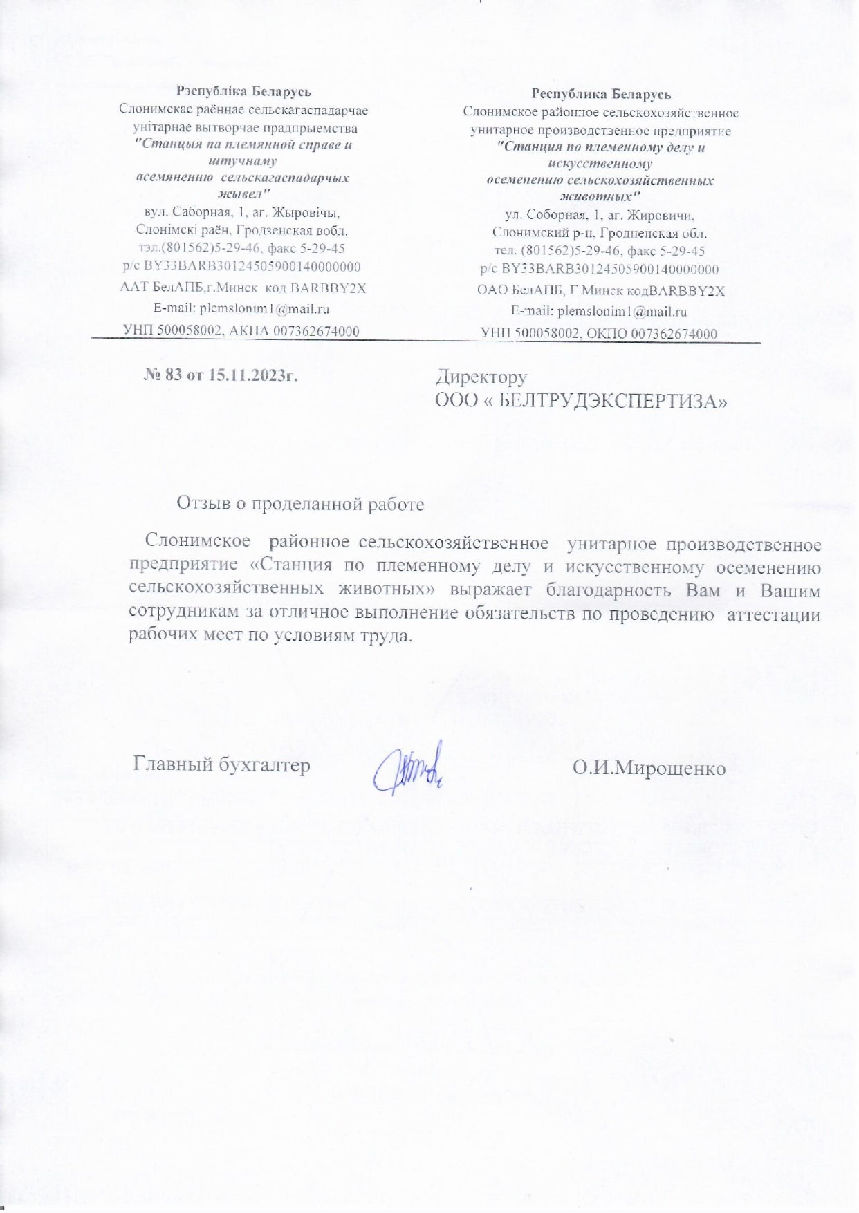 ООО «БЕЛТРУДЭКСПЕРТИЗА» окажет услуги по проведению аттестации рабочих мест, в том числе выполнит лабораторные измерения, оформит карты аттестации рабочих мест, произведёт оценку факторов производственной среды, тяжести и напряжённости трудового процесса, а также внесёт все данные в систему АИС Мониторинг условий труда на производстве для Гоэскспертизы и подготовит необходимые документы. И сопроводит до полного принятия результатов аттестации органами Государственной экспертизы условий труда.