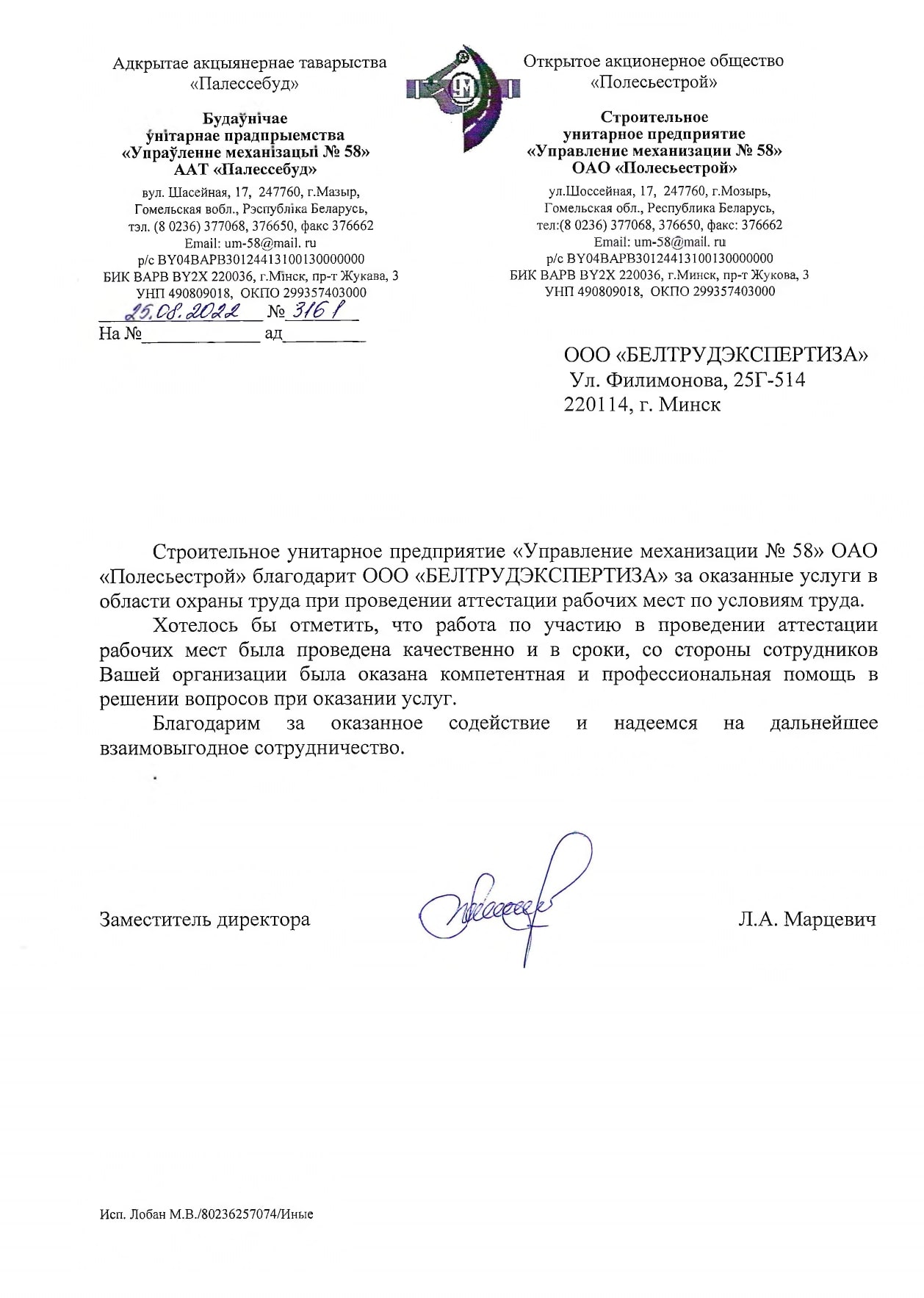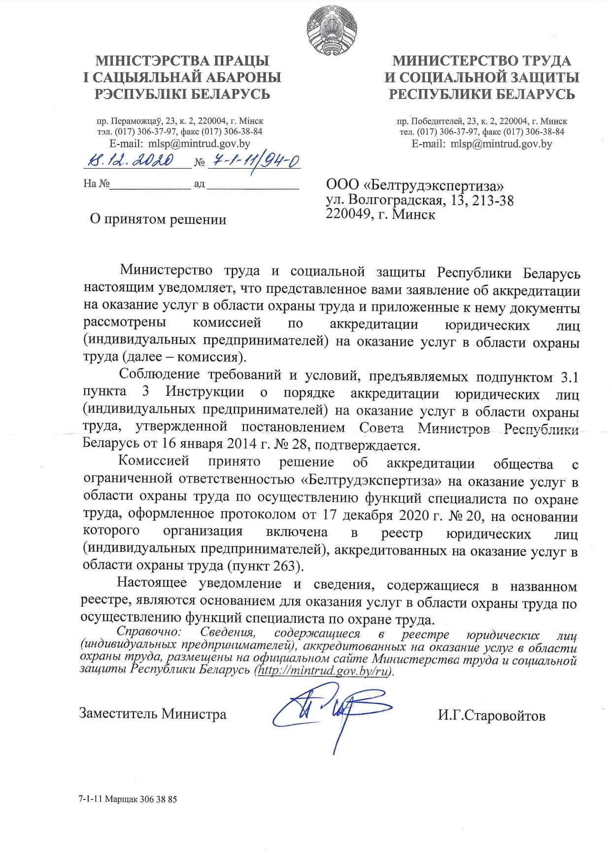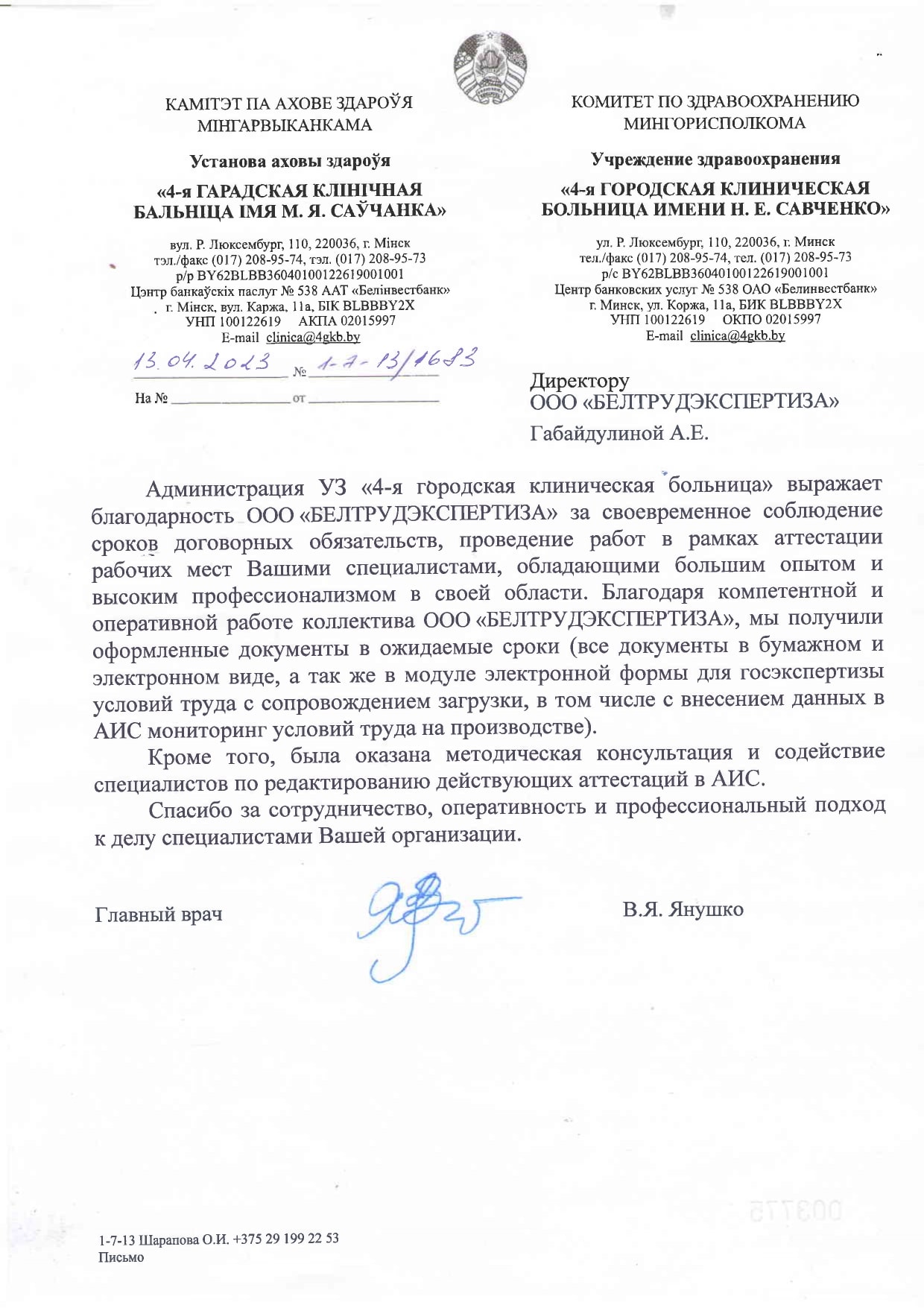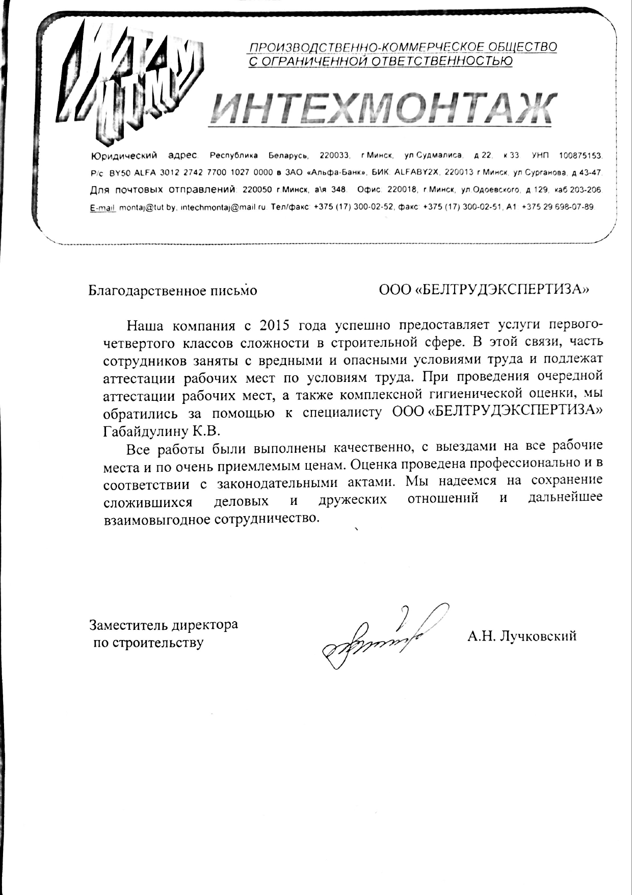 ООО «БЕЛТРУДЭКСПЕРТИЗА» окажет услуги по проведению аттестации рабочих мест, в том числе выполнит лабораторные измерения, оформит карты аттестации рабочих мест, произведёт оценку факторов производственной среды, тяжести и напряжённости трудового процесса, а также внесёт все данные в систему АИС Мониторинг условий труда на производстве для Гоэскспертизы и подготовит необходимые документы. И сопроводит до полного принятия результатов аттестации органами Государственной экспертизы условий труда.